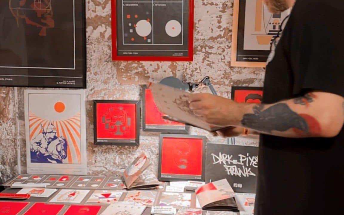 Dark Pixel Frank dà il nome a quel pezzo di lavoro che salvo dall’alienazione. Dalla perdita di controllo su ciò che faccio per correre dietro alle richieste dei clienti. Dentro ci sono alcune delle mie influenze visive: la concreta solidità geometrica di Malevich, l’arte al servizio della rivoluzione del suo allievo El Lissitzky, un po’ della colorata spiritualità di Kandinsky. C’è il fotogiornalismo in bianco e nero di cui Cartier-Bressons è solo il più famoso. Ma andrebbero bene anche Berengo Gardin, Tano D’Amico o Alberto Korda. Ci sono le forme e i colori della Bauhaus di Walter Gropius e lo spirito propagandistico dei dazebao maoisti. C’è la brutalità del manifesto politico degli anni ’70 e le scritte sui muri a pennellessa e biancone o con la bomboletta spray. Il graffio del punk e le tag del rap. C‘è la pixel art che ha accompagnato la mia generazione figlia degli anni ’80 e il vettoriale della grafica digitale contemporanea. E soprattiutto c’è la mia influenza politica, il marxismo, l’ottobre dell’assalto al cielo e del tentativo, da parte di una minoranza organizzata, di costruire l’indipendenza politica del proletariato e il movimento rivoluzionario che fino ai nostri giorni contribusce a cercare lo sconvolgimento dei rapporti capitalistici. Nel mio piccolo cerco di mantenere viva questa tradizione della distruzione della tradizione.